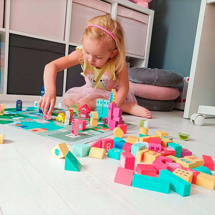 Ovaj bogat set uključuje set od 100 klasičnih kockica različitih oblika s brojevima i slovima, kockice koje prikazuju kuće, vozila, stabla, ljudske figure, poklopac za sortiranje, praktičnu kantu za pohranu i prostirku za slagalicu!